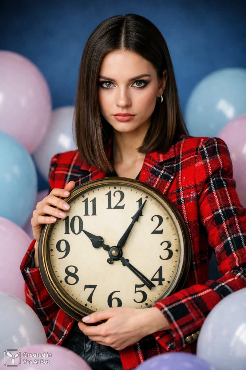 1. high detail, young woman with sleek straight hair wearing a striking red plaid blazer, holding a large vintage clock, intense gaze, surrounded by soft pastel balloons, deep blue gradient BG, soft natural lighting, canon eos r5, 85mm f/1.2 lens, eye-level angle, fashion editorial style.