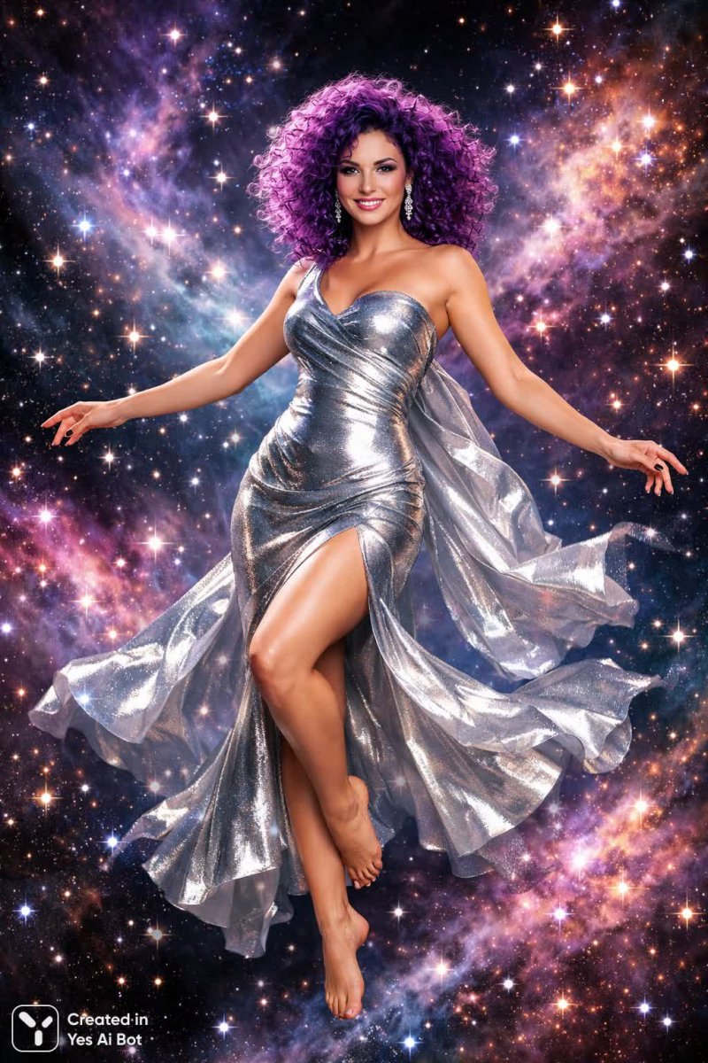 4. high resolution, a full body woman with wild curly purple hair in a metallic silver gown, floating among sparkling stars, looking directly at the camera with a confident smile, BG is galaxy-themed with swirling colors, shot with canon eos r5, rf 50mm f1.2l lens, eye-level shot, vibrant color grading, high detail.