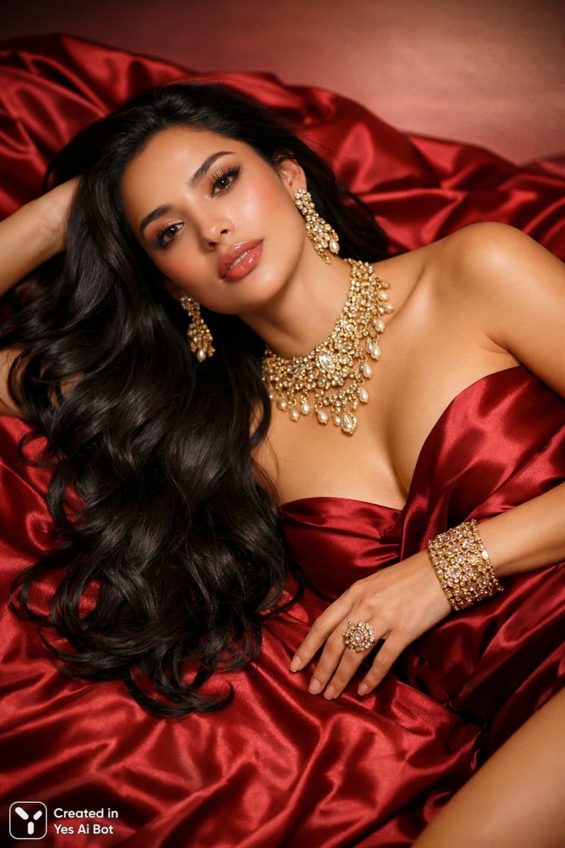 5. elegant portrait of woman reclining on plush red satin, long dark hair cascading down, minimal makeup featuring glossy lips, adorned with intricate gold jewelry, luxurious atmosphere created with soft gradient background, subtle lighting casting gentle shadows, nikon d850 camera, 85mm f/1.4 lens, overhead angle, hyper-realistic sharp detail, beauty editorial style.
