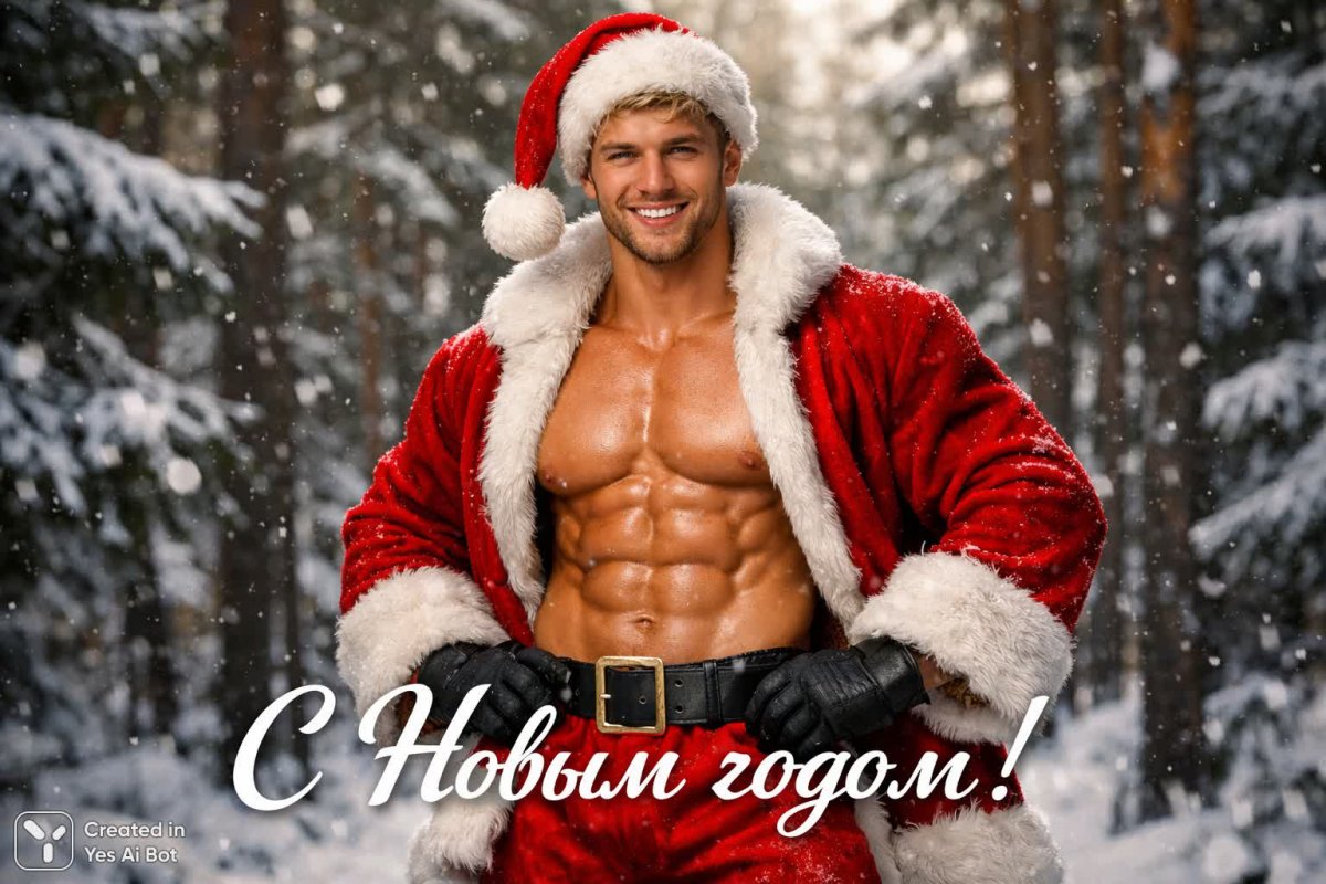 Мощный и уверенный в себе Дед Мороз, словно сошедший со страниц комикса или рекламного плаката, предстает перед нами во всей своей физической силе. Его рельефное тело, облаченное лишь в красные штаны и праздничный колпак, контрастирует с заснеженным фоном хвойного леса, создавая эффект неожиданной и даже дерзкой визитки зимнего волшебника. Мягкий снег кружится вокруг, подчеркивая атмосферу сказки и предновогодней радости. Естественное освещение акцентирует внимание на деталях: от текстуры ткани до выразительной улыбки на лице Деда Мороза, излучающей тепло и позитив. Изображение выполнено в высоком разрешении с кинематографическим стилем, благодаря чему каждый элемент – будь то пушистые ветви елей или мельчайшие снежинки – выглядит максимально реалистично. Этот образ заряжен энергией, силой и праздничным настроением, а лаконичное пожелание 'С новым годом!' служит финальным акцентом на волшебстве и радости грядущего торжества. Фотография запечатлела не просто персонажа, а символ зимнего чуда, воплощенный в мускулистом и жизнерадостном облике. Это яркий и запоминающийся визуальный образ, который способен вызвать улыбку и пробудить предвкушение новогодних чудес у каждого зрителя. Он сочетает в себе элементы юмора, силы и праздничной атмосферы, создавая поистине уникальное впечатление