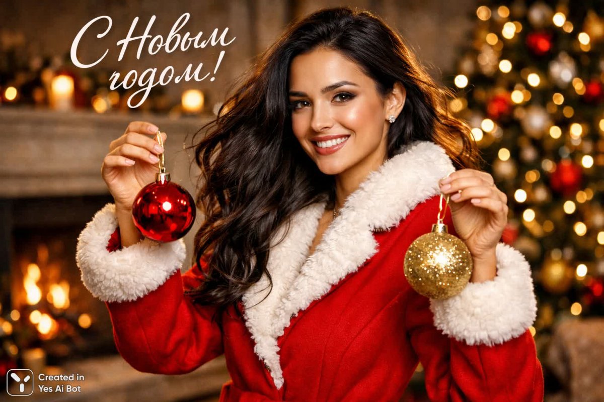 Яркая и жизнерадостная женщина с длинными струящимися темными волосами излучает праздничное настроение в роскошной гостиной. На ней эффектное красное пальто с белой отделкой, а в руках – нарядные новогодние украшения. Теплое свечение камина создает уютную и расслабляющую атмосферу, подчеркивая детали интерьера и наполняя пространство ощущением волшебства. Изображение выполнено с использованием объектива 35 мм, что обеспечивает широкую перспективу и естественную передачу цветов. Глубина резкости минимальна, акцентируя внимание на модели и ее праздничном настроении. Высокая детализация позволяет рассмотреть мельчайшие элементы декора и текстуру ткани пальто, создавая ощущение присутствия в этом уютном новогоднем пространстве. На фотографии крупным планом написано поздравление на русском языке: С Новым Годом!. Эта картина – воплощение тепла, радости и предвкушения праздника, идеально передающее дух нового года и рождественских чудес. Идеальный выбор для открыток или оформления интерьера в новогодней тематике, чтобы подарить близким частичку зимнего волшебства и позитивных эмоций. Это действительно прекрасный способ создать атмосферу праздника и напомнить о важности радостных моментов в жизни