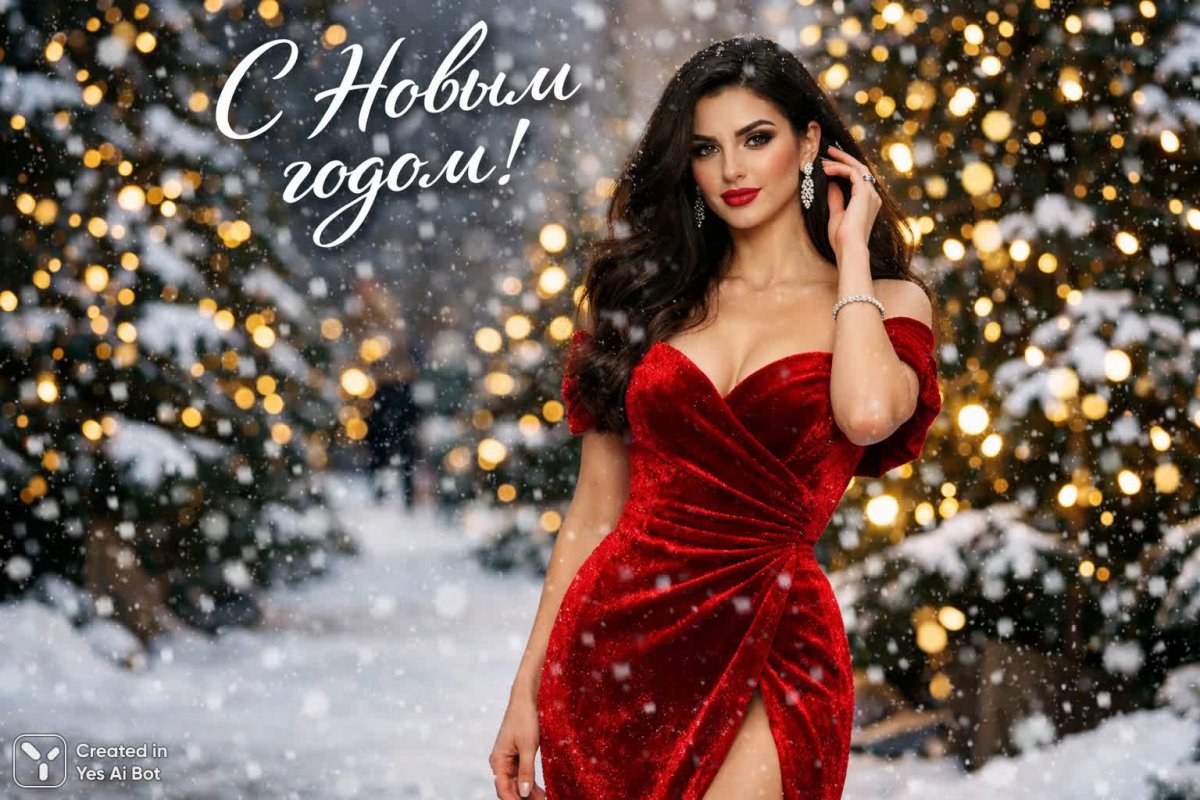 Волшебная атмосфера новогоднего чуда запечатлена в этом снимке. Элегантная женщина с длинными темными волосами предстает перед зрителем в роскошном красном бархатном платье, идеально подходящем для праздничного настроения. Мягкий снег кружится вокруг нее, создавая ощущение сказки и волшебства, а мерцающие гирлянды добавляют яркости и тепла этой зимней картине. Размытый фон передает ощущение глубины и простора, подчеркивая красоту момента. Свет мягкий и естественный, что позволяет детально рассмотреть фактуру ткани платья и другие элементы композиции. Фотография выполнена в высоком разрешении с акцентом на мельчайшие детали, создавая эффект присутствия и погружая зрителя в атмосферу праздника. Кажется, будто время остановилось, чтобы запечатлеть эту красоту и передать ощущение радости и предвкушения. На снимке красуется надпись на русском языке С новым годом!, что делает его особенно трогательным и душевным. Это идеальный образ для новогодней открытки или праздничного оформления, наполненный теплом и очарованием зимнего волшебства, дарящий ощущение надежды и светлых ожиданий в преддверии нового года. Вся композиция излучает праздничное настроение и создает атмосферу уюта и тепла, несмотря на зимнюю погоду