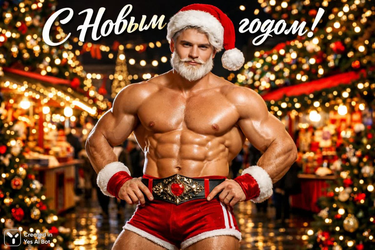 Смелый и молодой Санта Клаус демонстрирует подтянутую фигуру в праздничном красном поясе и перчатках. Он гордо позирует на фоне оживленного рождественского рынка, залитого мерцающим светом гирлянд и украшений. Картина выполнена с высоким контрастом, акцент сделан на выразительном лице персонажа. Используется богатая цветовая палитра, создающая атмосферу волшебства и радости. Внизу изображения красуется текст на русском языке: 'С Новым Годом!'. Эта яркая и динамичная композиция передает дух праздника и предвкушение новогодних чудес. Изображение идеально подходит для открыток, баннеров или других рекламных материалов, посвященных Новому году. Молодой Санта Клаус, далекий от традиционного образа, излучает энергию и позитив, что делает его привлекательным для современной аудитории. Он словно воплощает собой новые традиции и свежий взгляд на любимый праздник. Яркие цвета и детализированное исполнение позволяют зрителю полностью погрузиться в атмосферу новогоднего волшебства и почувствовать приближение праздника. Это изображение - настоящий символ радости, надежды и счастливых моментов, которые ждут нас в Новом Году. Оно вызывает улыбку и дарит ощущение тепла и уюта