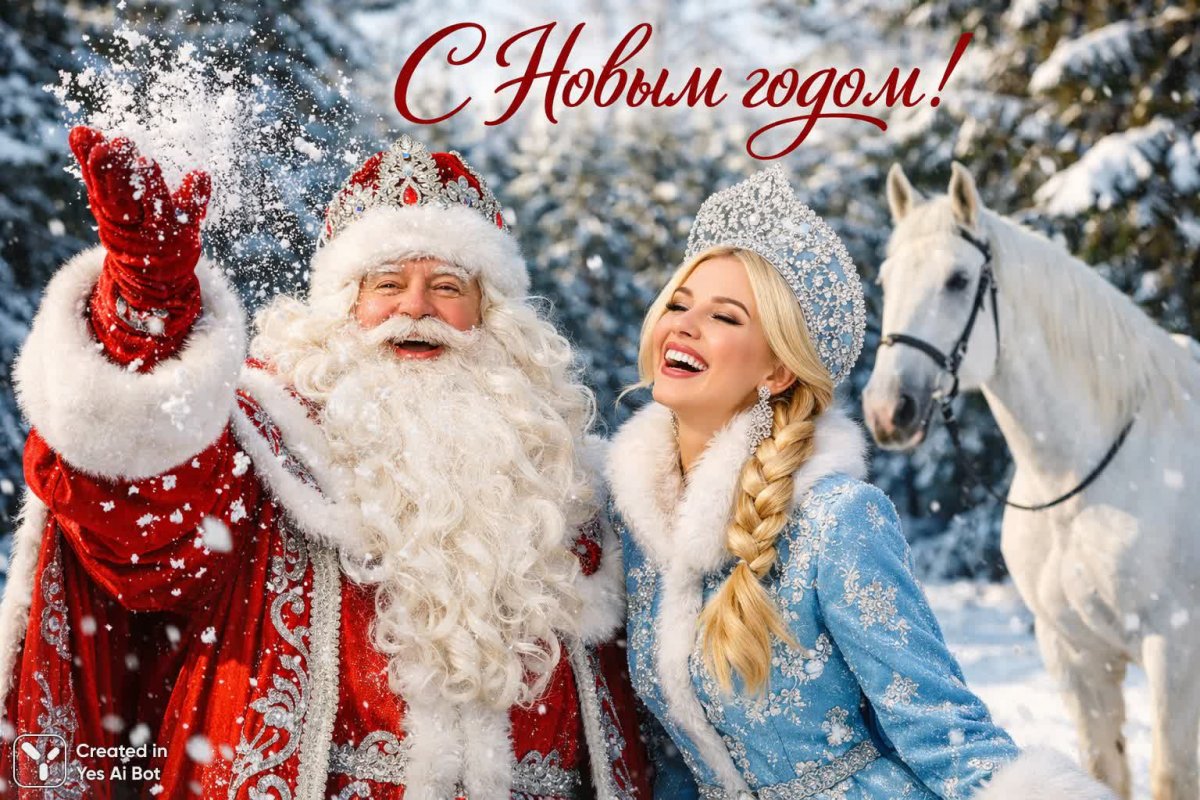 Изображение, созданное нейросетью Sora, передает атмосферу новогоднего волшебства. На нем запечатлен Дед Мороз, весело подбрасывающий снежинки в воздух, а рядом с ним Снегурочка искренне смеется от радости. Идиллическую сцену дополняет изящная белая лошадь, стоящая на фоне живописного заснеженного леса. Яркое естественное освещение создает праздничную и сказочную атмосферу, а высокая четкость позволяет рассмотреть счастливые выражения лиц персонажей. Насыщенные цвета оживляют зимний пейзаж, делая изображение визуально привлекательным. В нижней части изображения присутствует надпись на русском языке: 'С новым годом!'. Это не просто картинка, а воплощение духа новогоднего праздника – символ радости, надежды и предвкушения чудес в новом году, вызывающий теплые чувства уюта и ностальгии по традициям. Иллюстрация выполнена в стилях fashion и luxury с высокой детализацией и создана при помощи нейросети Sora Images, используя Telegram Bot - Yes Ai. Она идеально подходит для поздравлений близким и создания праздничного настроения.