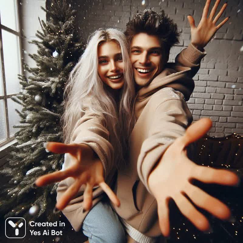 Ностальгическая зимняя сказка, сотканная из тепла и света. Фотография, словно сошедшая со старой кинопленки, переносит нас в уютную фотостудию, где время замерло в моменте радости и беззаботности. Белые кирпичные стены служат фоном для трогательной сцены: пара, окруженная мерцанием гирлянд и темными еловыми ветвями с блестящими шарами, утопает в атмосфере волшебной ночи. Эффект двойной экспозиции и кракелюра добавляют снимку винтажной прелести, создавая ощущение прикосновения к истории. Парень, укрытый бежевой толстовкой с капюшоном, и девушка в бежевой куртке, словно ангел с распахнутыми руками, запечатлены в искреннем моменте игры – они смеются с закрытыми глазами, наслаждаясь обществом друг друга. Снег медленно падает, создавая ощущение уюта и тепла, а мягкое освещение подчеркивает естественную красоту героев. Этот снимок – не просто фотография, это запечатленная эмоция, воплощение зимнего настроения и безграничного счастья влюбленных. Он передает атмосферу радости и нежности, пробуждая самые светлые воспоминания и даря ощущение сказки. Сквозь легкую дымку времени видны искренние улыбки и неподдельный восторг от момента, который хочется сохранить навсегда