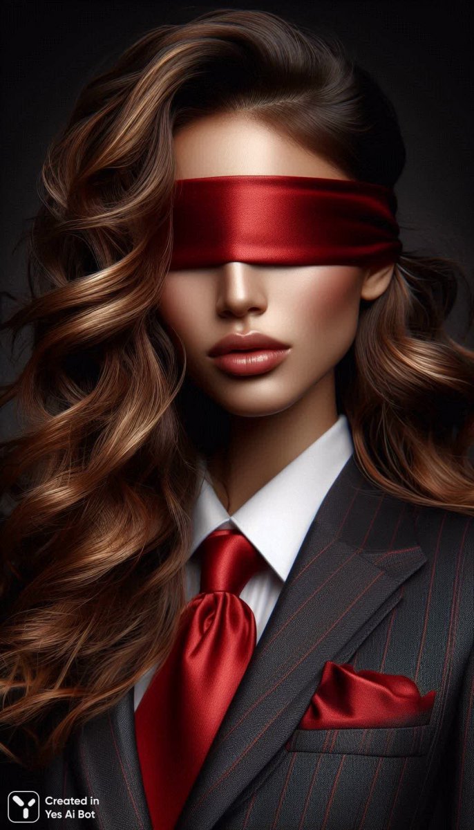 high quality, close-up portrait woman with long wavy hair, wearing tailored suit, festive holiday look, red satin blindfold covers eyes, smooth silky fabric, canon eos r5, rf 85mm f/1.2l lens, eye-level angle, sharp focus, minimal shadows.