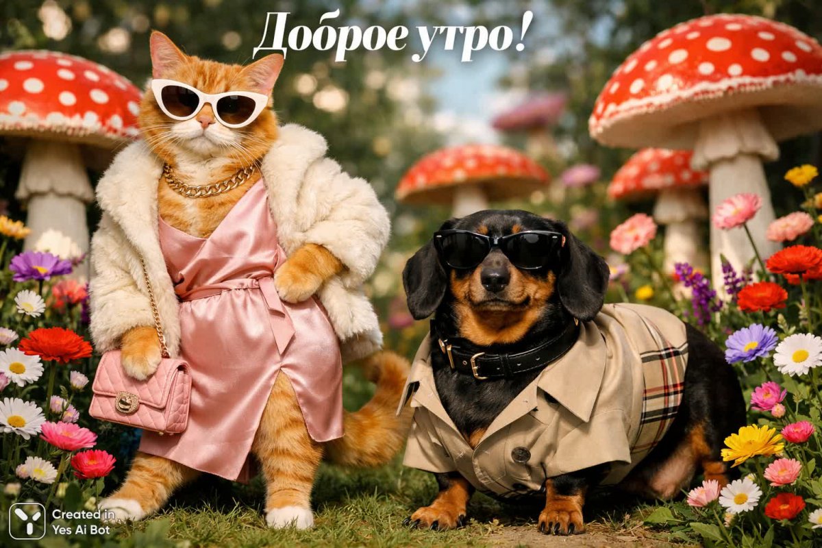1. text on russian: "good morning!" a funny orange cat with a plump dachshund, both standing in a whimsical park filled with colorful flowers and oversized mushrooms.
