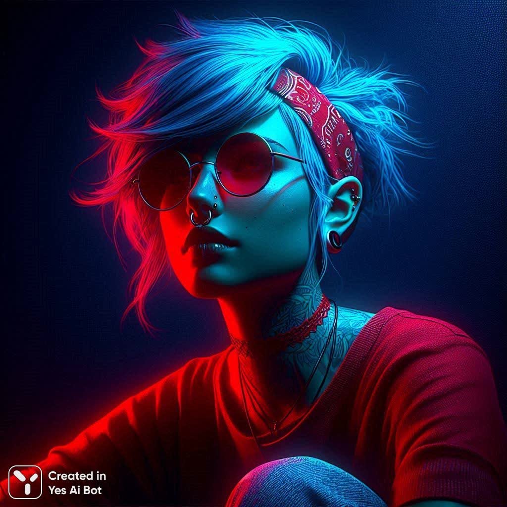 blue hair, red headband, round sunglasses, nose ring, red lace top, blue shirt, ripped jeans, necklace, sitting pose, neon lighting, red and blue glow, dark background, dramatic shadows, digital art, cyberpunk aesthetic, detailed face, expressive eyes, stylized fashion, moody atmosphere, high contrast, soft focus background, artistic rendering, portrait composition, modern fantasy style, vibrant colors, textured clothing, glowing highlights, intimate setting, cool tones, warm accents, character illustration, fashion forward, edgy look, confident expression, layered outfit, dynamic lighting, painterly effect