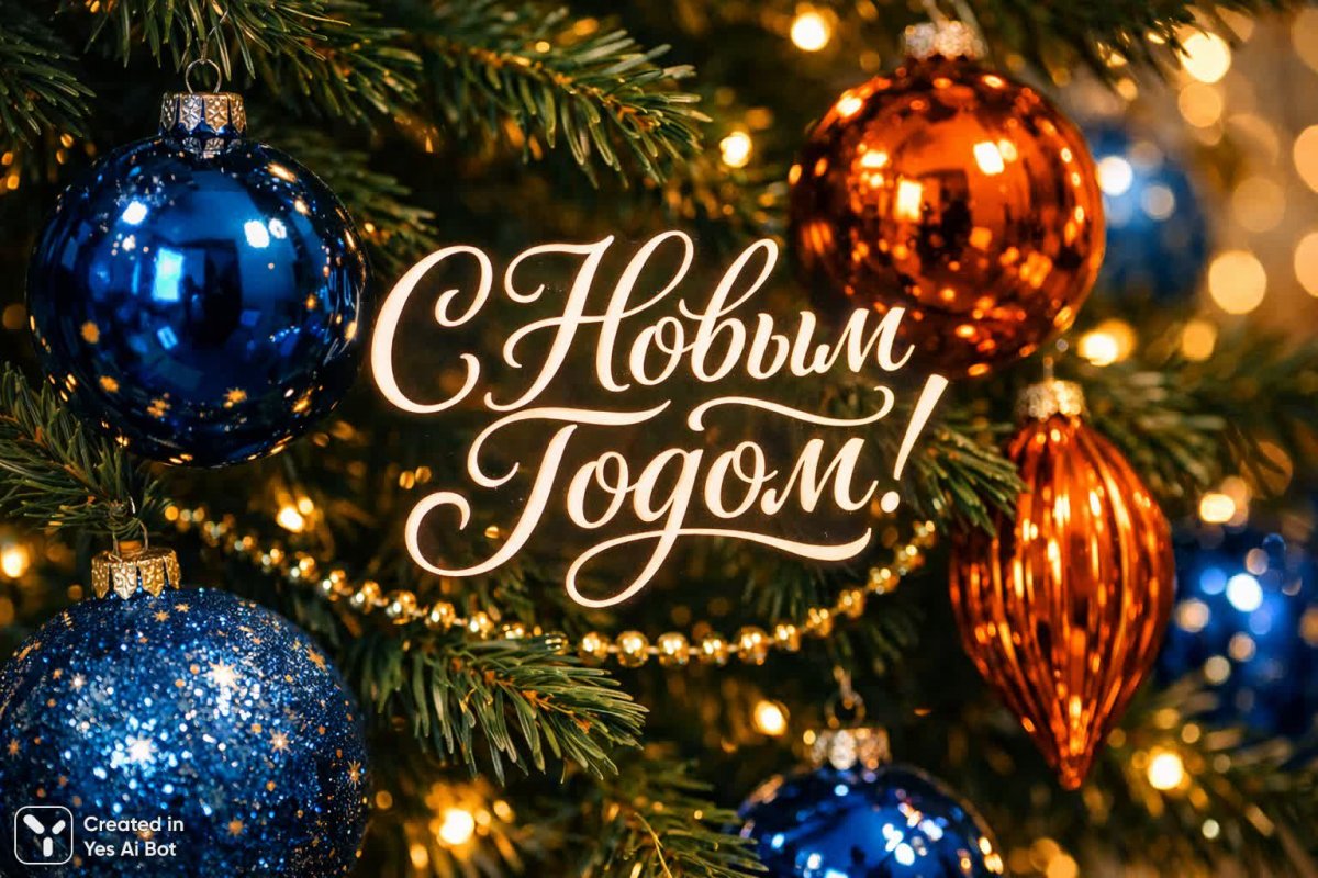 text on russian beauty letters: "happy new year!" high-resolution, close-up of blue and orange ornaments on lush green christmas tree, soft diffused lighting reflecting off shiny surfaces, warm cozy atmosphere, background slightly blurred, canon eos r5, rf 50mm f/1.2l lens, eye-level angle, hyper-realistic detail, festive mood.