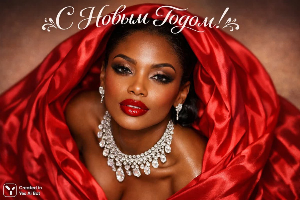 3. text on russian beauty letters: "happy new year!" stunning portrait of a woman with dark skin and bold red lipstick, wrapped in luxurious red silk fabric, shimmering jewelry adorns her neck, background soft gradient, canon eos r5, rf 85mm f/1.2l lens, overhead angle, high sharpness, beauty editorial style.