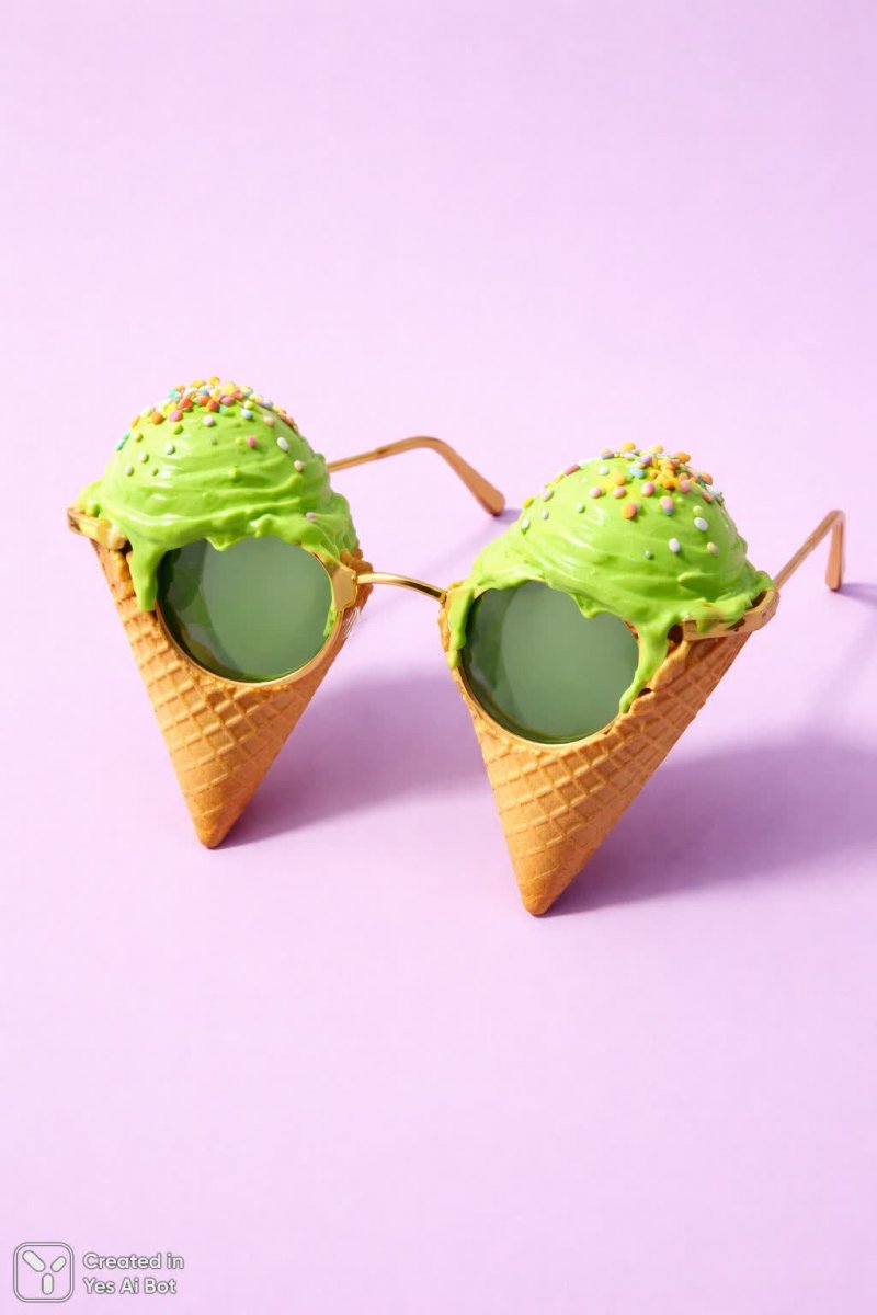 2. two eccentric ice cream cones with bright green scoops, arranged as a quirky pair of sunglasses, set against a pastel lavender backdrop, imaginative design, clean lines, playful and surreal art.