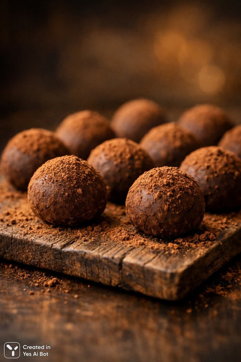 smooth chocolate truffles dusted with cocoa powder, arranged neatly on a rustic wooden board, BG softly blurred to accentuate the rich textures, high-quality imagery, warm ambient lighting, taken with a Fujifilm X-T4 and a 56mm f/1.2 lens.
