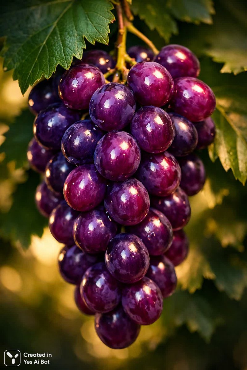 bright purple grapes clustered together, plump and glossy, deep green leaves providing a natural backdrop, BG softly blurred to emphasize the texture, high-quality photography, soft warm lighting, taken with a Nikon D850 and a 50mm f/1.8 lens.