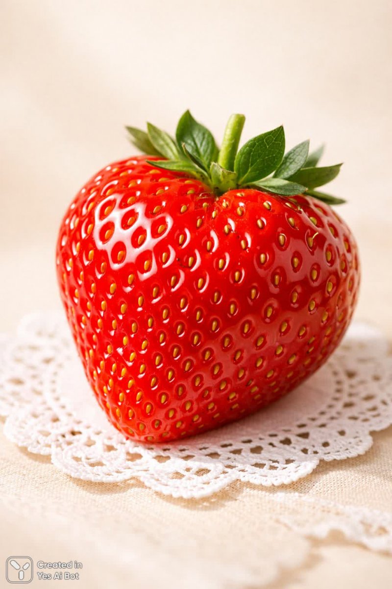 delicious oversized strawberry with glossy skin, resting on a delicate lace doily, set against a soft beige backdrop to enhance its vibrant color, macro detail, bright soft lighting, photographed with a Canon EOS 5D Mark IV and a 100mm f/2.8L macro lens.