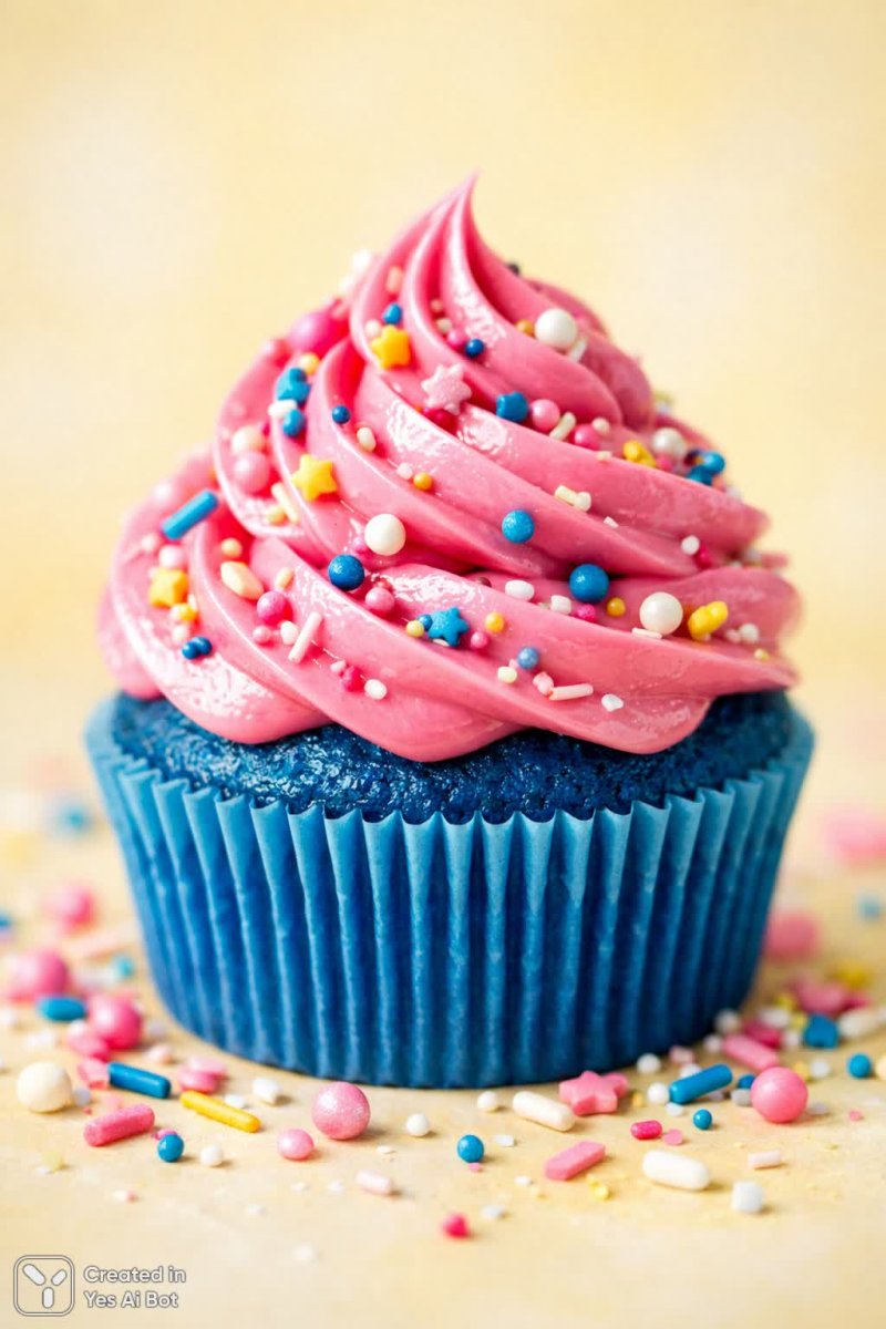 a vibrant blue cupcake topped with glossy pink frosting, sprinkles scattered around, set against a softly blurred pastel yellow background, high detail, macro photography, soft lighting, captured with a Canon EOS R5 and an EF 100mm f/2.8L macro lens.