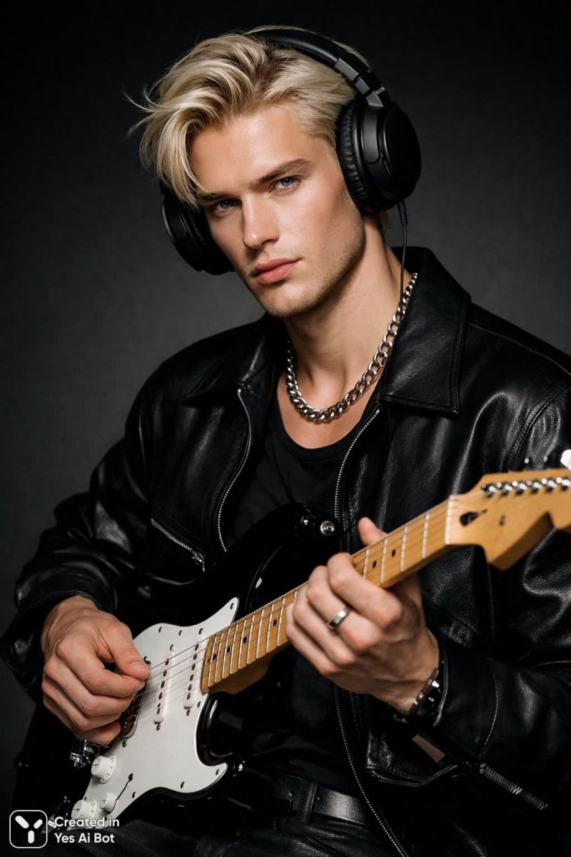 Стильный портрет уверенного в себе блондина, воплощающий дух современной моды и музыки. В кадре запечатлен мужчина с безупречной кожей, выделенной профессиональным студийным освещением, который непринужденно играет на электрогитаре, облаченный в предметы роскошной одежды. Его образ дополняют объемные наушники, подчеркивающие его индивидуальность и музыкальную страсть. Минималистичный темный фон акцентирует внимание на выразительных чертах лица модели, создавая эффект резкой фокусировки и глубины. Картина пронизана духом современности и дерзости, демонстрируя эстетику, сочетающую в себе элегантность высокой моды и энергию альтернативной культуры. Этот образ – манифест уверенности, стиля и творческой свободы, передающий атмосферу современного мегаполиса и вдохновляющий на самовыражение через моду и музыку. Он словно создан для обложки модного журнала или рекламной кампании бренда, ориентированного на молодую и прогрессивную аудиторию. Каждый элемент композиции тщательно выверен, чтобы создать сильный визуальный образ, который запоминается и вызывает положительные эмоции у зрителя. Это не просто фотография – это история о стиле, уверенности и творческом потенциале