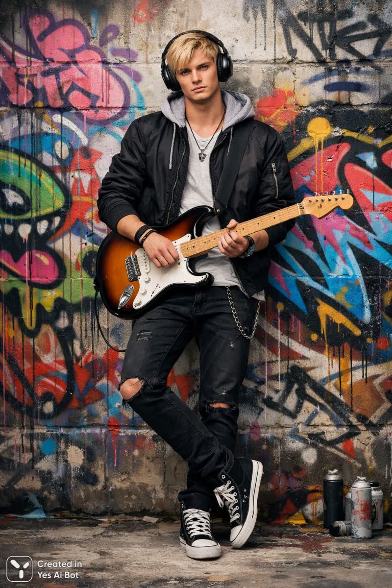 full-body portrait of a young blonde man in casual attire, wearing large headphones and holding an electric guitar, set against a graffiti-covered wall, vibrant colors, soft diffused lighting, high-resolution detail, urban style.