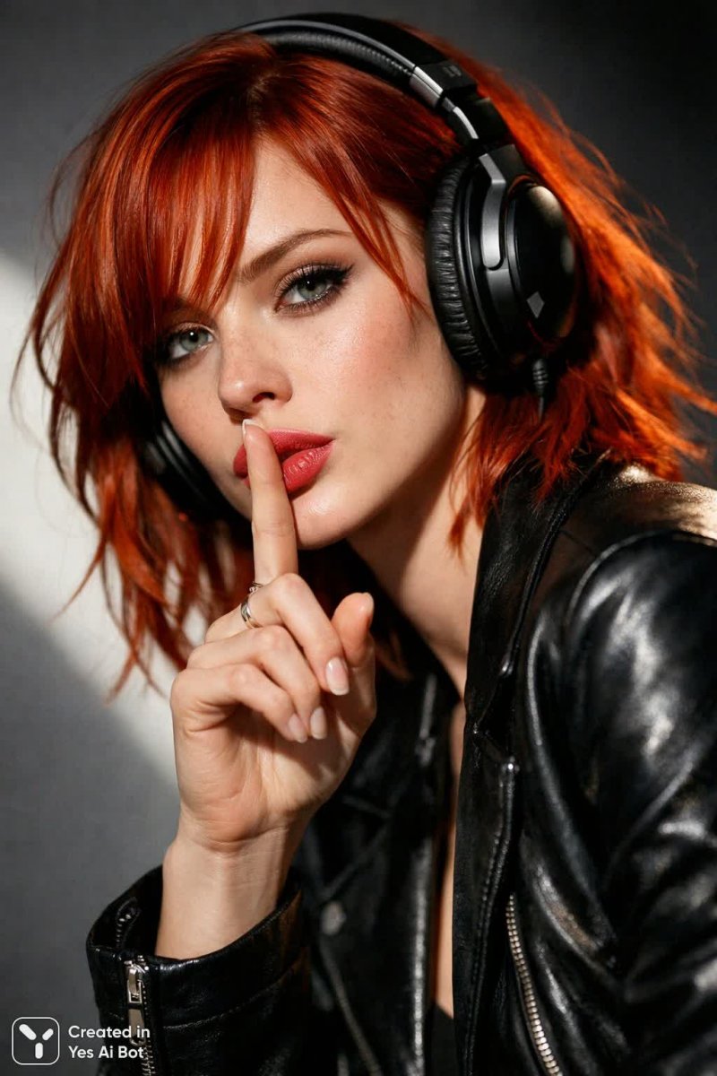 a red-haired girl in headphones with a finger to her lips signaling silence, high-contrast portrait with a soft focus, dramatic lighting, minimalist background, camera angle slightly tilted, using a 50mm lens for depth, ultra-realistic detail, vibrant color accents.