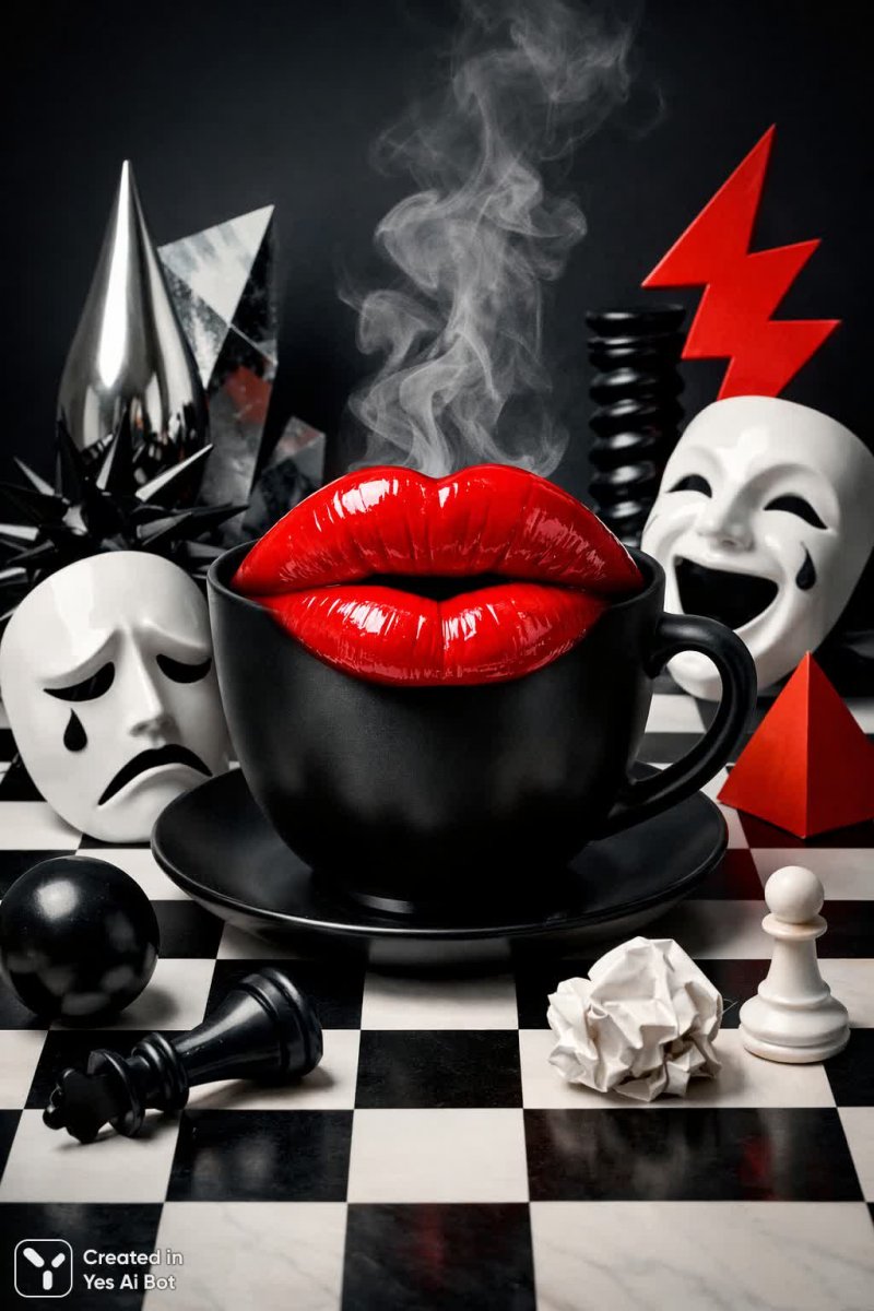 a surreal composition features a chessboard with a matte black coffee cup, red lips appearing as a striking centerpiece, surrounded by geometric figures of emotions, evoking a sense of internal chaos.