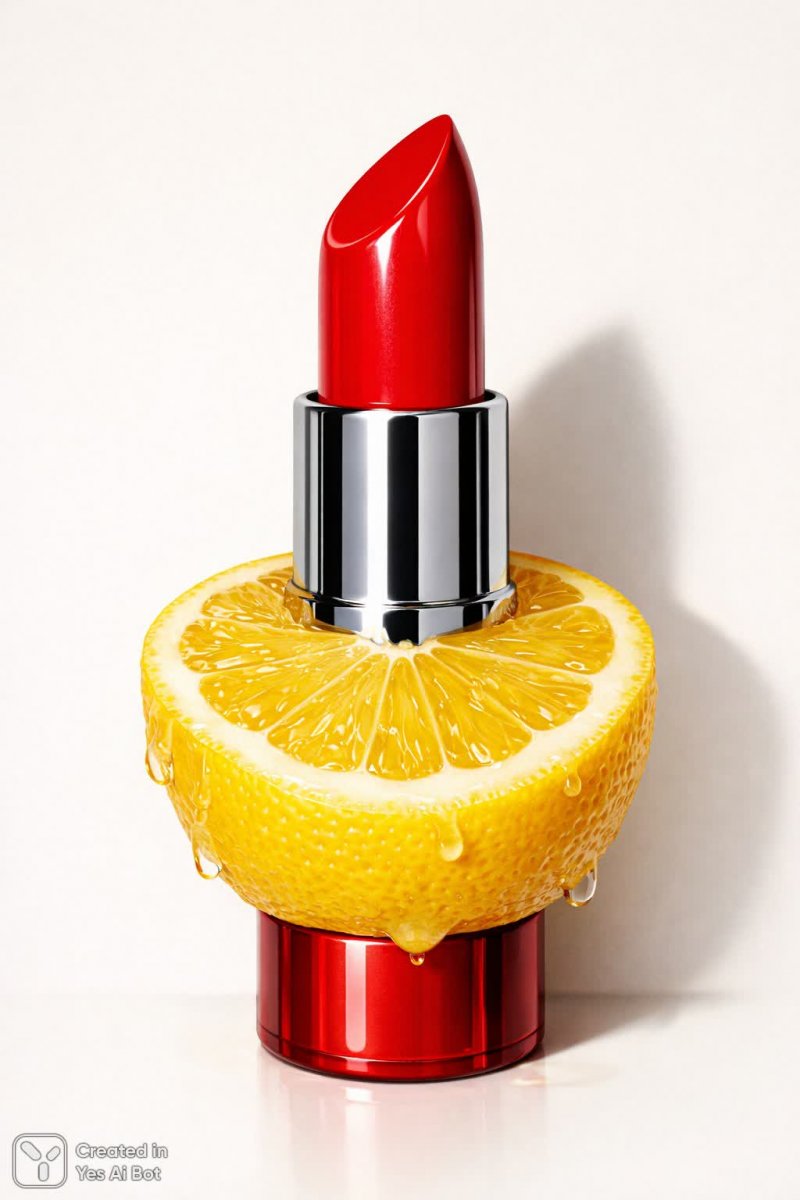 a close-up of a glossy red lipstick tube fused with a slice of lemon, presenting a vibrant color palette, minimalist background, soft shadows, detailed realism, imaginative composition.