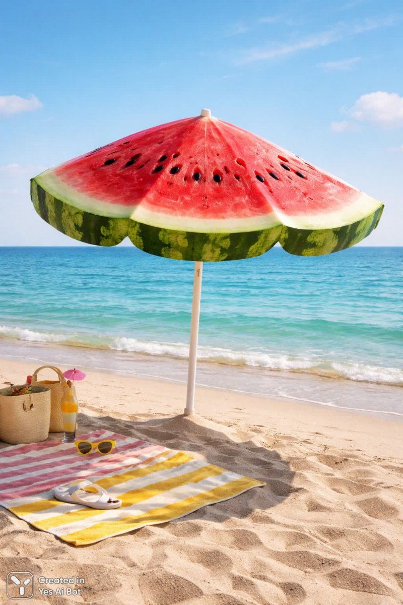 a surreal slice of watermelon transformed into a vibrant red beach umbrella, nestled on a sandy pastel blue shore, imaginative scene, high detail, bright lighting, playful and creative arrangement.