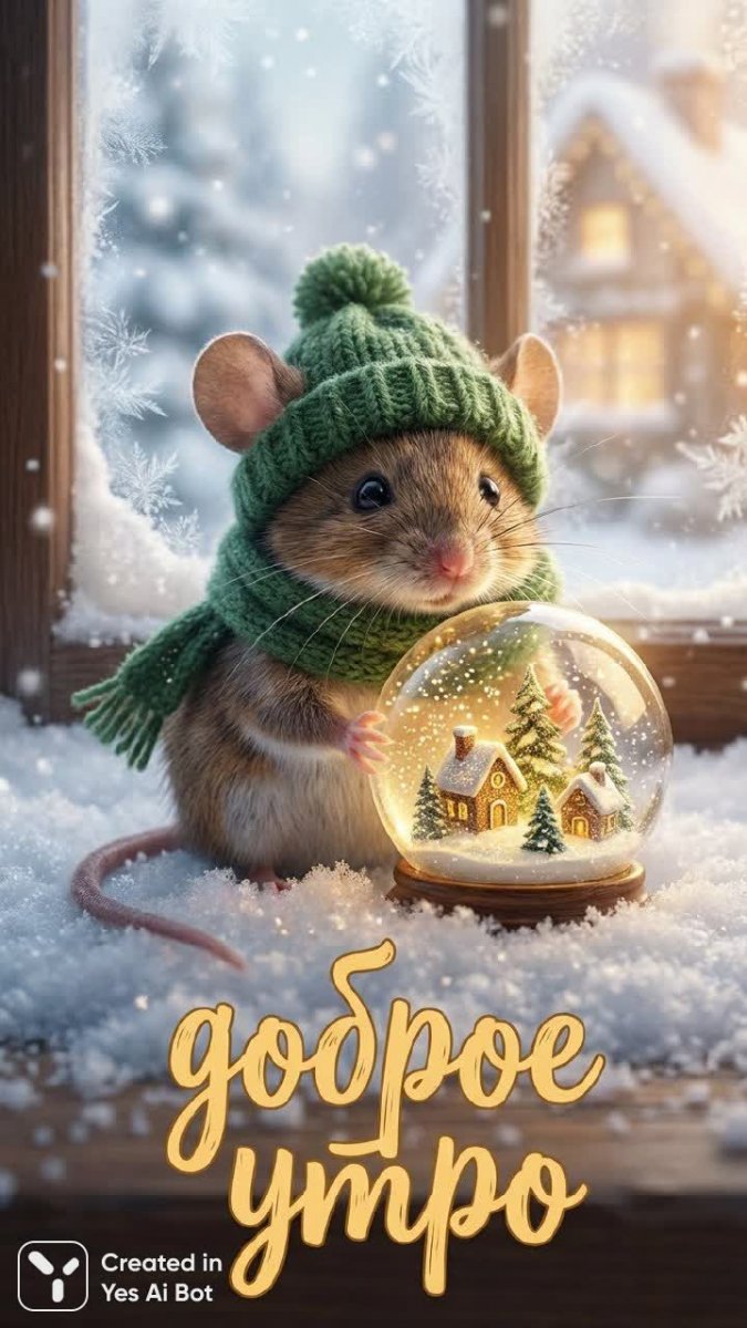 text on russian: "good morning!" an adorable mouse in a warm, oversized green sweater, surrounded by snowflakes, holds a snow globe that glitters with tiny winter scenes, radiating cozy charm.