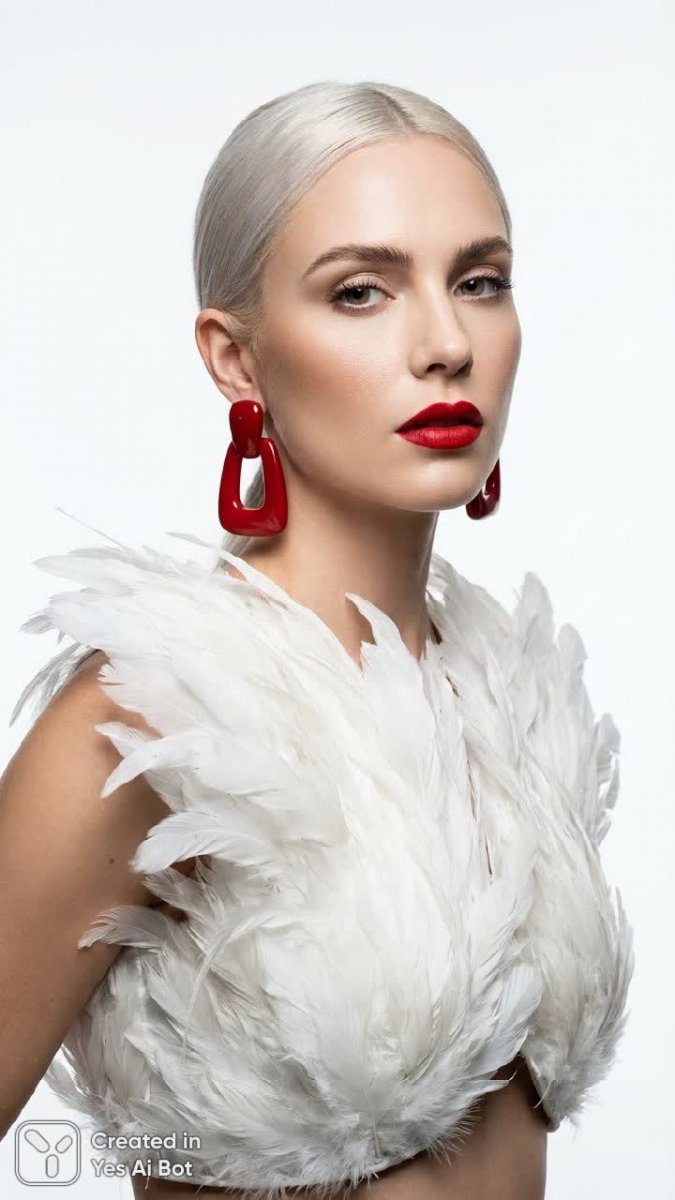 Изображение представляет собой портрет современной женщины, выполненный в стиле высокой моды и отличающийся драматизмом. Образ характеризуется платиновыми волосами, воздушным белоснежным нарядом из перьев, создающим эффект невесомости, и яркими алыми акцентами, добавляющими смелости и выразительности. Композиция выстроена на основе четких линий и тщательно продуманного освещения, что придает ей графичность и минимализм, фокусируя внимание на деталях лица модели: мимолетном выражении, тонкой коже и завораживающем взгляде.