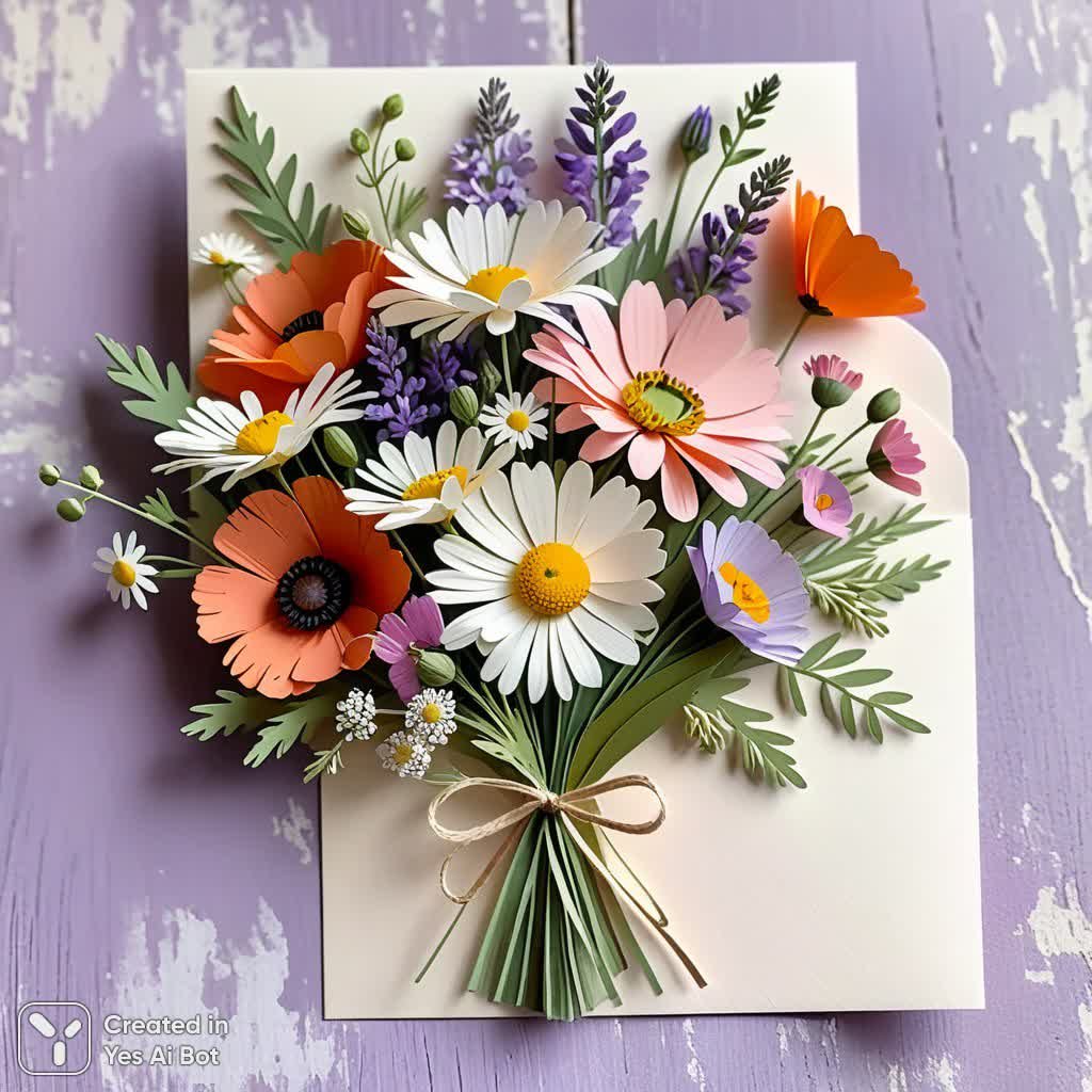 A botanical greeting card: detailed illustrations of wildflowers (daisies, lavender, poppies) in a loose bouquet. Soft акварельная текстура, natural green and pink hues, rustic paper background.