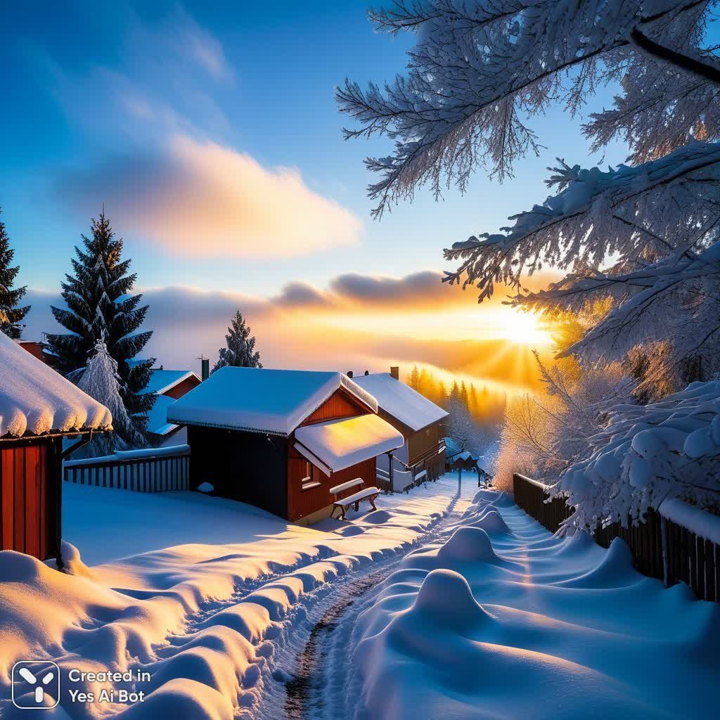 Декабрьское утро в объятиях снежной сказки и первых лучей солнца - Пример изображения, созданного ИИ Stable Diffusion