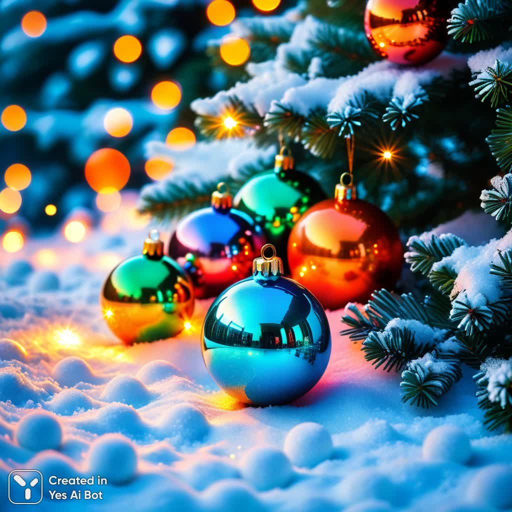 professional photo, зимний снежный сверкающий рождественский вечер, сказочное, волшебное, серебристо, голубисто, лазурно, изумрудно, багряно, апельсиново, новогодние переливающиеся шары, иллюминация, предновогоднее, UltraHD,ближний план, HDR