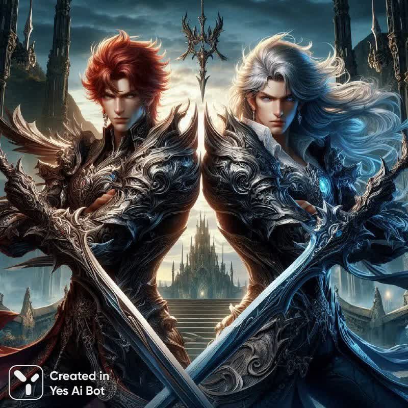 Эпическое столкновение двух воинов на руинах забытого замка под бледным светом огромной луны. Напряжение витает в воздухе, когда рыжеволосый богатырь с яростным взглядом сталкивает свои клинки с изящным юношей, чьи белоснежные волосы развеваются на ветру, а небесно-голубые глаза полны решимости. Контраст между их внешностью и физической силой подчеркивает глубину противостояния. Один – воплощение грубой мощи и гнева, готовый обрушить свой гнев на врага. Другой – символ молодости, грации и хрупкой красоты, но с железной волей в сердце. Развалины древнего замка служат мрачным фоном для этой схватки, напоминая о былой славе и неизбежности разрушения. Вся сцена пронизана духом классического фэнтези, где судьбы героев переплетаются на фоне вечного противостояния добра и зла, света и тьмы. Каждая деталь – от тщательно выкованных доспехов до лунного сияния – создает атмосферу таинственности и опасности, заставляя зрителя затаить дыхание в ожидании исхода битвы. Это не просто схватка двух воинов, это столкновение принципов, судеб и надежд. Всё указывает на то, что исход поединка определит будущее этого мира