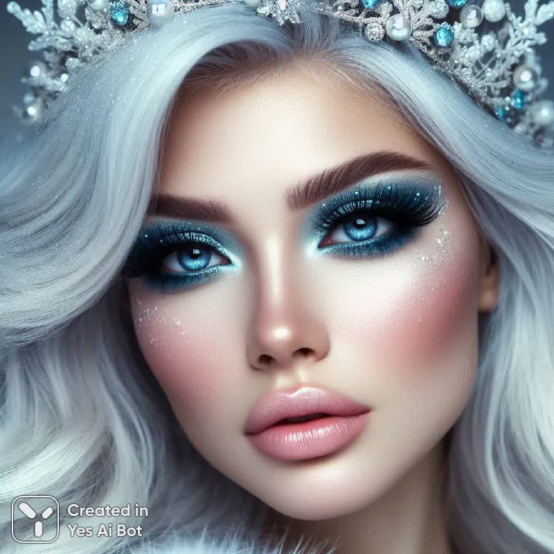 Завораживающая картина зимней красоты, где юная богиня января предстает в образе хрустальной королевы. Ее нежная бледная кожа контрастирует с волшебным сиянием волос цвета небесной лазури, а темные голубые ресницы обрамляют взгляд, полный загадочности и чистоты. Легкий намек на морозный узор на кончиках ресниц добавляет образу неземной шарм, словно она соткана из снежинок и льда. Макияж подчеркивает ее ангельскую внешность: мерцающие сине-белые тени создают эффект заснеженного утра, а жемчужные акценты на скулах придают лицу свежесть и объем. Губы украшены нежным перламутровым оттенком голубого цвета, словно отражая небесную даль. На голове – изящная тиара, сотканная изо льдинных кристаллов, символизирующая власть и величие зимней поры. Нежное серебристо-белое меховое манто, бережно удерживаемое в ее тонких, словно фарфоровых, пальцах с лазурным маникюром, добавляет образу уюта и тепла, несмотря на свирепствующую за окном снежную бурю. Крупный план позволяет рассмотреть каждую деталь: от мельчайших переливов света на волосах до изящных линий лица, создавая ощущение полного погружения в этот сказочный мир. Это не просто портрет – это поэма, написанная языком холода и красоты, воплощение зимней элегантности и хрупкости. Взгляд, устремленный сквозь снежную завесу, полон таинственности и надежды на грядущую весну