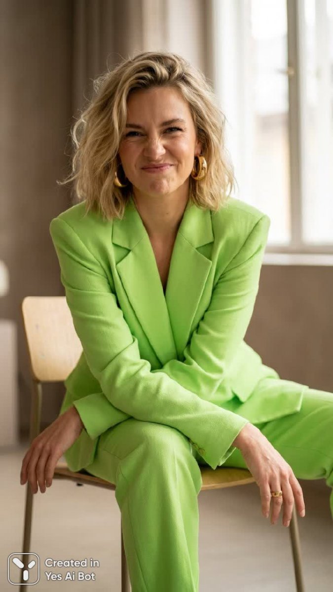professional photo, canon eos r5, f2.8 lens, close-up, model with long legs wearing a tailored neon green suit with exaggerated shoulders, tousled short blonde hair, seated on a minimalist chair, rich gold earrings glinting, a playful yet assertive expression, soft ambient light enhancing vibrant hues.