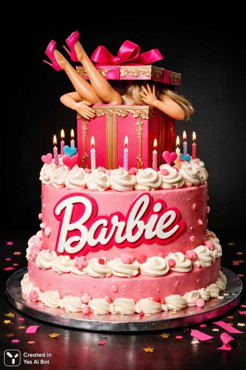 Яркий и сюрреалистичный снимок в фотореалистичном стиле, созданный на профессиональную камеру Canon EOS R5 с объективом 50mm. Кадровая композиция подчёркнута кинематографичным освещением, создающим эффектный контраст и глубину. В центре внимания – огромный торт ко дню рождения, украшенный в узнаваемом стиле Barbie, а на его вершине забавным акцентом расположилась игрушечная кукла, попавшая в декоративную коробку. Цветовая палитра насыщена смелыми и неожиданными сочетаниями, что добавляет изображению игривости и юмора. Высокое разрешение позволяет рассмотреть каждую деталь этого необычного произведения лого-арта, где переплетаются элементы реальности и фантазии, создавая запоминающийся визуальный образ, полный символизма и оригинальности. Картина вызывает улыбку и заставляет задуматься о неожиданных поворотах судьбы и абсурдности бытия, представленных в яркой и стильной форме. Это не просто фотография, а целая история, рассказанная языком цвета, света и формы