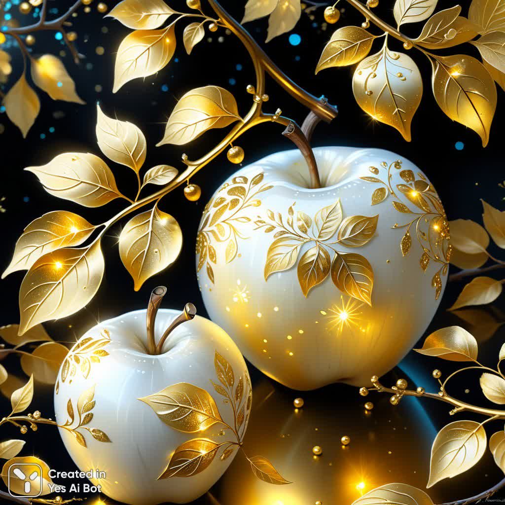 Яркое великолепие осеннего сада оживает на полотне цифровой живописи. Белоснежные яблоки, словно капли застывшего света, сияют в лучах солнца, отражая его тепло золотым ореолом. Их кожица переливается, играя бликами, а тонкие прожилки напоминают изящную филигрань из драгоценного металла. Листья, окрашенные в золото и бронзу, шелестят под легким ветерком, создавая ощущение волшебной атмосферы. В глубине изображения мерцает биолюминесцентное свечение, добавляя картине таинственности и загадочности. Каждая деталь проработана с невероятной тщательностью: от мельчайших золотых блесток, рассыпанных по поверхности яблок и листьев, до крошечных семян, скрытых в их сердцевине. Золото здесь не просто цвет – это символ тепла, изобилия и красоты природы. Это произведение искусства словно приглашает зрителя окунуться в сказочный мир, где реальность переплетается с фантазией, а золото становится символом вечной гармонии и вдохновения. Каждая частица изображения пронизана светом и теплом, создавая неповторимую атмосферу волшебства и умиротворения. Насладитесь красотой этого цифрового шедевра, где каждый оттенок и текстура передают всю прелесть осеннего великолепия. Это ода осени в золотых тонах с элементами фантастического свечения