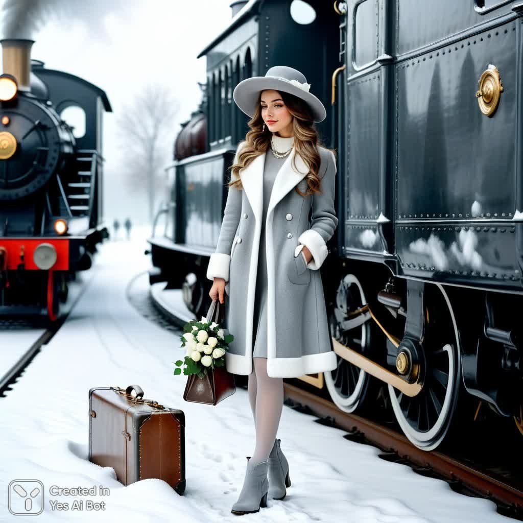Винтажная элегантность: Ретро-портрет очаровательной девушки в зимнем пейзаже с поездом - Картинка, сгенерированная нейросетью Stable Diffusion