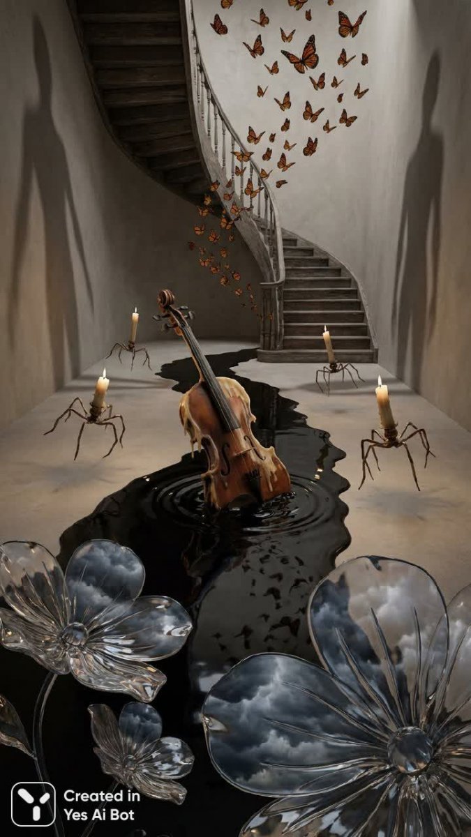 surreal art, professional photo, canon eos r5, sigma art lens 35mm, wide angle, photorealistic, hyper-realism, ultra detailed, studio lighting, cinematic, strange dreamlike a floating violin melting into a river of ink, candles sprouting legs and dancing in midair, a staircase spiraling into a cloud of butterflies, shadows of human figures stretching into abstract silhouettes, oversized flowers with glass petals reflecting a stormy sky