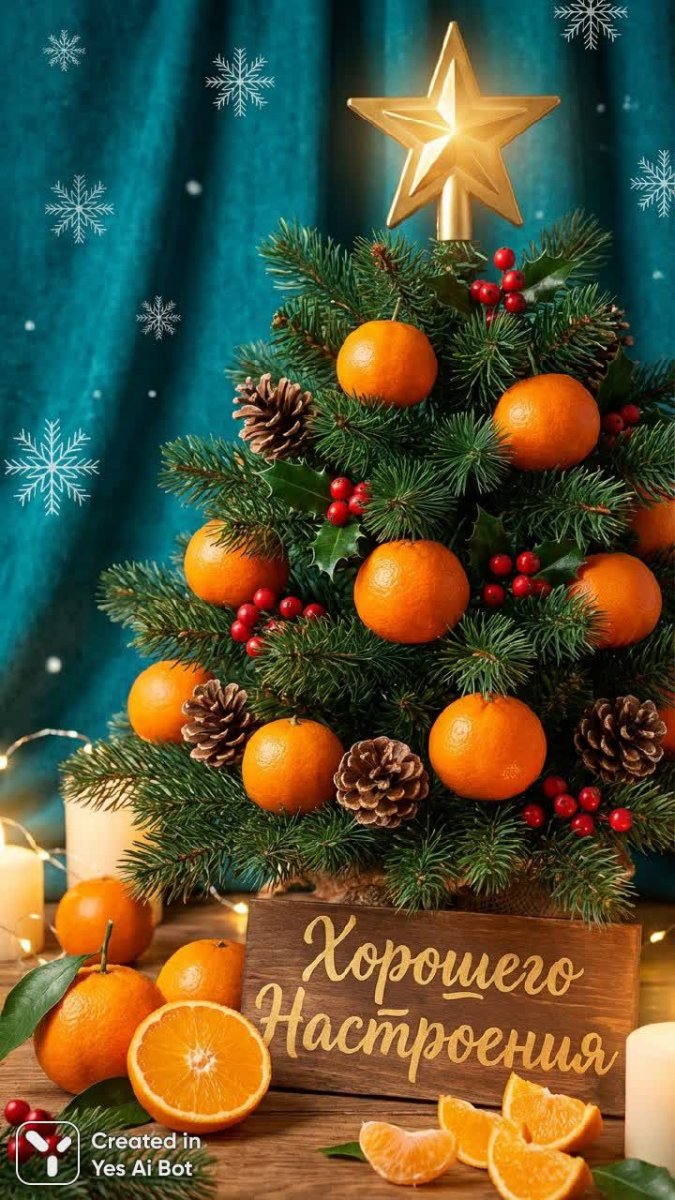 Яркая рождественская елка, украшенная ярко-оранжевыми мандаринами вместо традиционных украшений, а также красными ягодами и шишками. Елка стоит на темно-бирюзовом фоне, усеянном большими стилизованными белыми снежинками, создавая зимнюю сцену. На верхушке елки блестит большое золотое украшение в форме звезды, отражая свет. На переднем плане изображены еще мандарины, некоторые из которых разрезаны и разложены у основания елки, демонстрируя свою сочную оранжевую мякоть. Ветви елки имеют насыщенный темно-зеленый цвет, создавая контраст с мандаринами и заснеженным фоном. Под елкой находится декоративная надпись стилизованным шрифтом с поздравлени...