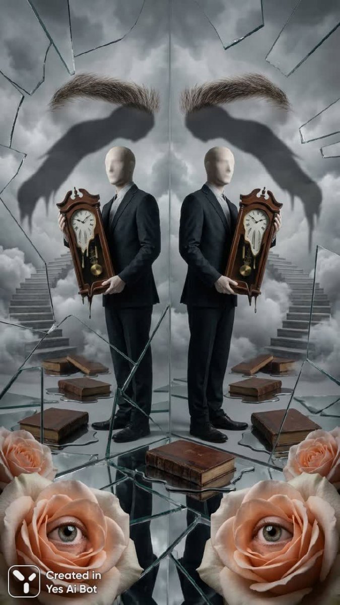 Этот завораживающий снимок переносит зрителя в мир сюрреалистической фантазии, где реальность и сновидение сливаются воедино. Снятый на профессиональную камеру Canon EOS R5 с использованием объектива Sigma Art 35mm, кадр поражает своей детализацией и фотореализмом, достигающим гипер-реалистичных масштабов. Широкий угол обзора позволяет полностью погрузиться в эту странную, почти кошмарную атмосферу. В центре композиции – два абсолютно идентичных двойника, стоящих в лабиринте из разбитых зеркал, символизирующих раздвоенность личности и искаженное восприятие себя. Каждый держит плавящиеся часы, отсылающие к знаменитым работам Сальвадора Дали и подчеркивающие течение времени и его субъективность. Дополняют сюрреалистическую картину парящие брови, отбрасывающие причудливые тени на пейзаж из тающих книг – метафора утраты знаний и разрушения интеллектуальных ценностей. Бесконечные лестницы, уходящие в никуда среди облаков, создают ощущение потерянности и отсутствия цели. Цветы с человеческими глазами, выглядывающими из лепестков, добавляют тревожности и подчеркивают зловещий характер происходящего. Игра света и тени, мастерски выполненная при помощи студийного освещения, создает кинематографический эффект и усиливает общее ощущение нереальности происходящего. Картина пропитана чувством жуткой двойственности, отчуждения и глубокого психологического дискомфорта, оставляя зрителя в состоянии задумчивости и легкого беспокойства перед лицом непознанного. Это визуальное исследование человеческой психики и границ реальности, запечатленное с безупречной технической точностью и художественной смелостью