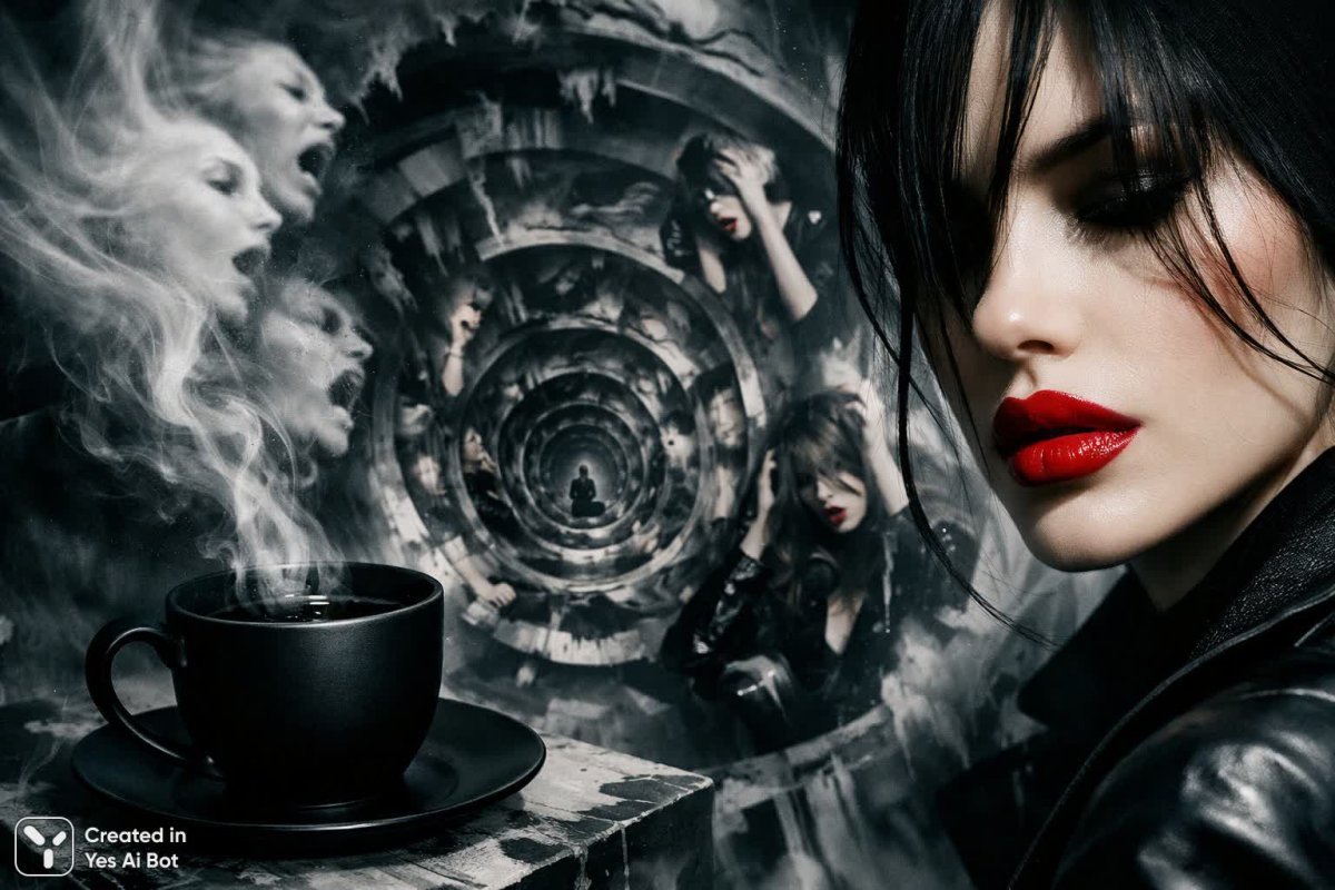 a haunting piece blends schizophrenia with surreal elements, showcasing a matte black coffee cup beside ghostly whispers and a person with red lips, all within an infinite spiral of internal chaos.