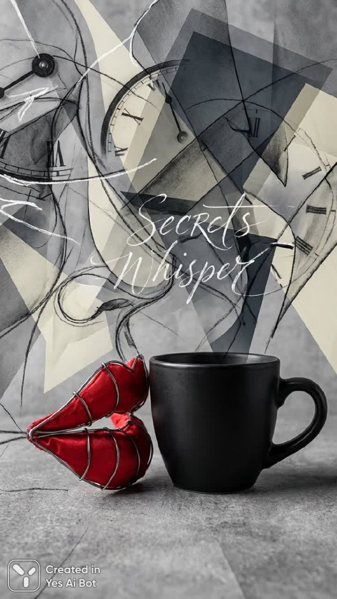 an abstract piece illustrates a surreal scene where red lips whisper secrets beside a matte black coffee cup, surrounded by broken lines and shifting realities on a monochromatic background.