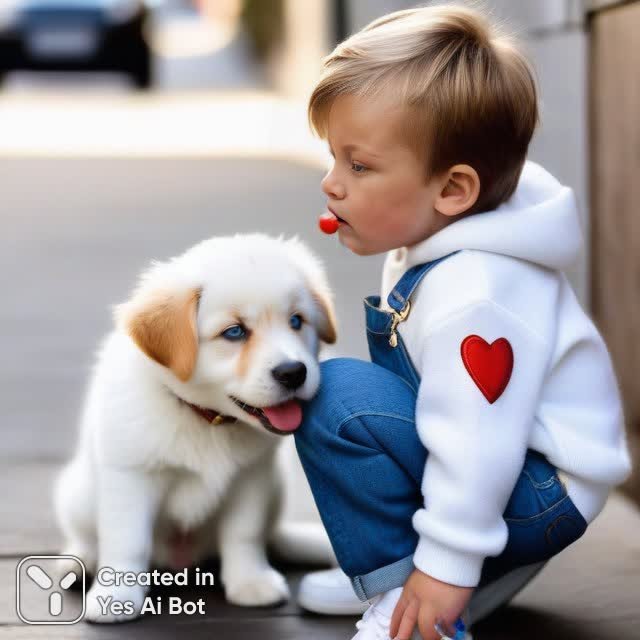 Нежная сцена трогательной дружбы между мальчиком и уличным псом запечатлена в этом снимке. Юный парень с выразительными голубыми глазами излучает чистоту и доброту, одетый он в белоснежный свитер, украшенный яркими эмодзи, и джинсовый комбинезон с милыми заплатками. Его образ дополняют белые кроссовки, придающие ему легкости и беззаботности. Внимание приковывает момент искренней нежности: мальчик склоняется, чтобы поцеловать пушистого и немного недовольного уличного пса. Контраст между радостью на лице мальчика и слегка хмурым выражением морды собаки создает очаровательную динамику, наполненную теплом и привязанностью. Эта фотография – гимн преданности и безусловной любви, которая не знает границ и соединяет сердца разных существ. Она передает ощущение уюта, безопасности и истинной дружбы, способное согреть душу даже в самый холодный день. Взгляд мальчика полон заботы и ласки, а собака, несмотря на свой непростой жизненный опыт, отвечает ему доверием и принятием. Это изображение – воплощение искренних чувств, которые заставляют верить в лучшее и дарят надежду на светлое будущее. Кажется, что эта дружба способна преодолеть любые трудности и стать настоящим чудом