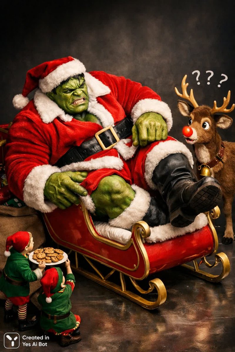 Халк в костюме Санты: нелепые приключения и рождественское безумие - Картинка из нейросети Sora Image