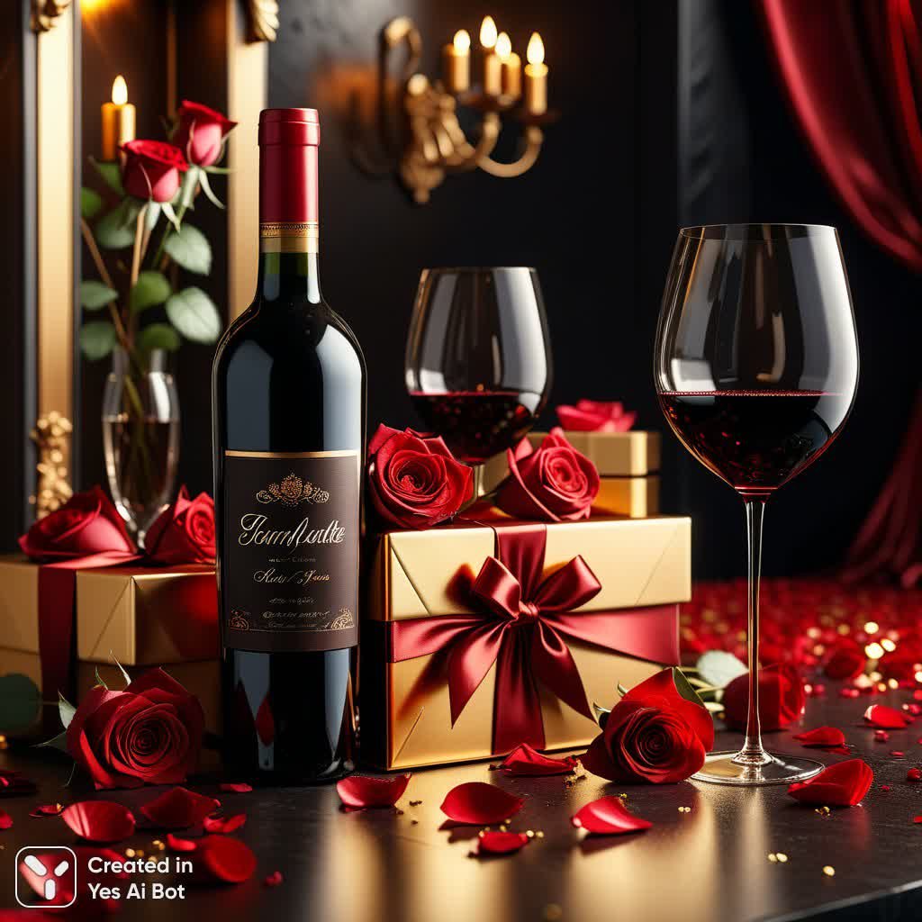 Изысканная гиперреалистичная 3D иллюстрация в стиле DALL-E 3 передает атмосферу романтики и утонченного наслаждения. В центре композиции – два хрустальных бокала, наполненных рубиновым вином, играющего бликами света, словно драгоценные камни. Рядом элегантно стоят две золотые коробки квадратной формы, украшенные широкими атласными лентами глубокого шоколадного оттенка, символизирующие роскошь и изысканный вкус. На столе, рядом с коробками, расположились изысканные шоколадные конфеты, добавляющие нотку сладости в общую картину. На заднем плане отчетливо видна полная бутылка темного вина, подчеркивающая глубину вкуса и благородство напитка. Весь интерьер утопает в буйстве темно-красных бархатных роз и лепестков, создающих ощущение чувственности и страсти. Теплый золотистый свет мягко освещает все элементы композиции, отражаясь на гладкой поверхности стекла и блестящем золоте, рождая магические блики и оттенки. Каждая деталь проработана с невероятной точностью, создавая иллюзию реальности и погружая зрителя в мир роскоши и изысканности. Изображение выполнено в высочайшем разрешении 8k, позволяя рассмотреть мельчайшие детали и насладиться безупречным качеством исполнения. Отсутствие текста позволяет полностью сосредоточиться на визуальной составляющей произведения, усиливая эмоциональное воздействие и создавая неповторимую атмосферу романтического уединения и изысканного вкуса