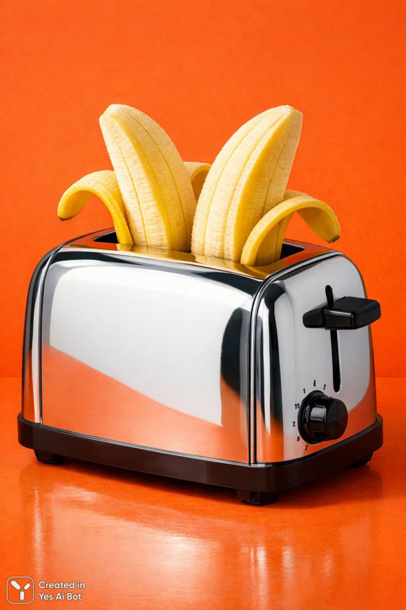 Завораживающий сюрреалистический натюрморт, где привычный тостер преображается в источник неожиданной радости – из него вылетают аппетитные ломтики ярко-желтого банана вместо ожидаемого хлеба. Яркий оранжевый фон подчеркивает сочность и свежесть фруктов, создавая ощущение солнечного утра и беззаботного настроения. Реалистичная детализация каждой части изображения позволяет рассмотреть мельчайшие текстуры: гладкую поверхность тостера, бархатистую кожуру бананов, насыщенный цвет фона. Изображение выполнено в виде креативной фотографии еды с использованием чистых линий и продуманной композиции, демонстрируя оригинальный взгляд на кулинарное искусство. Это не просто фотография, а фантастическая игра воображения, сочетающая в себе элементы реализма и абсурда, вызывающая улыбку и желание попробовать этот необычный фруктовый десерт. Композиция продумана до мелочей, создавая гармоничное сочетание цветов и форм, которое привлекает внимание и оставляет приятное впечатление. Безусловно, это произведение искусства в мире фотографии, демонстрирующее мастерство и креативность автора, способного увидеть необычное в обыденном предмете. Яркие цвета и неожиданная замена тостов на бананы делают этот образ запоминающимся и оригинальным, идеальным для иллюстрации или рекламной кампании, ориентированной на творческих людей и любителей нестандартных решений