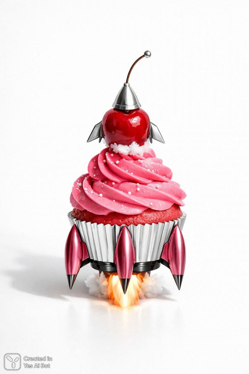 a vibrant pink cupcake topped with a glossy cherry, artfully transformed into a miniature rocket ship, displayed against a crisp white backdrop, minimalistic design, soft shadows, whimsical and hyper-realistic style.