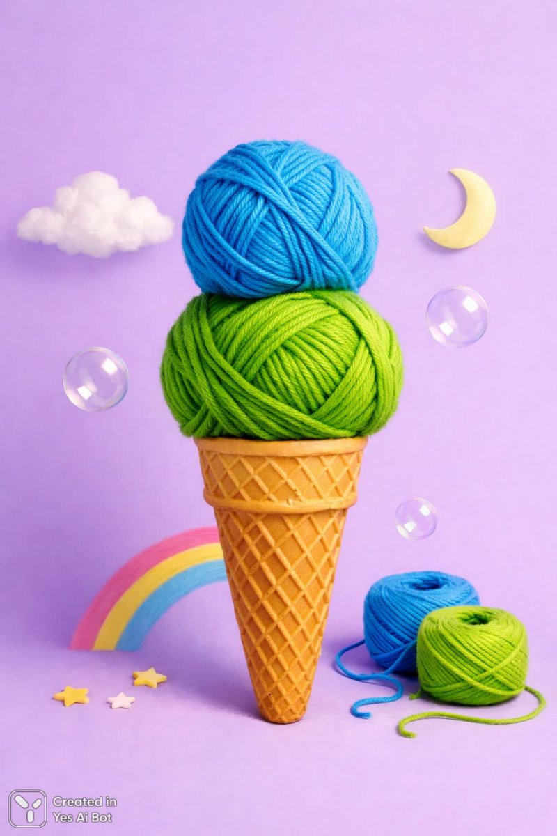 a surreal ice cream cone with two scoops of bright blue and green yarn instead of ice cream, set against a pastel purple background, playful and imaginative composition, high contrast, soft lighting.
