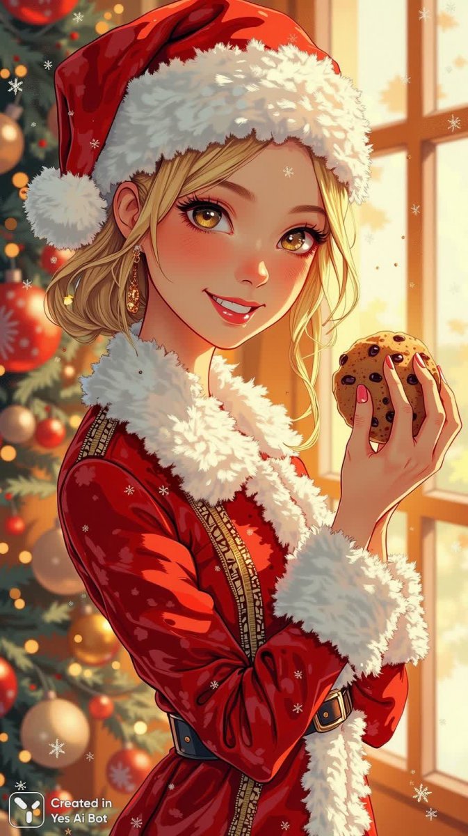 professional photo, shooting from the side, clad in a stylish Santa-inspired outfit with velvet details, holding a cookie in one hand while winking at the camera, cozy indoor setting, warm holiday vibes.