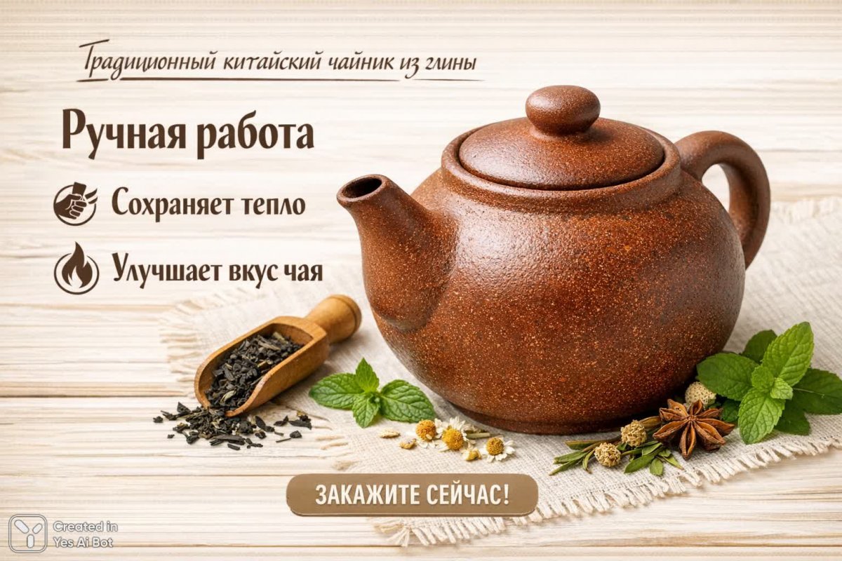 Создайте инфографику для чайника из глины: большой снимок чайника на светлом фоне, добавьте элементы чая и трав, текст “Ручная работа, сохраняет тепло, улучшает вкус чая”. Используйте стиль минимализма с акцентом на естественность. Примените шаблон из SUPA.ru для визуализации, добавьте призыв к действию.