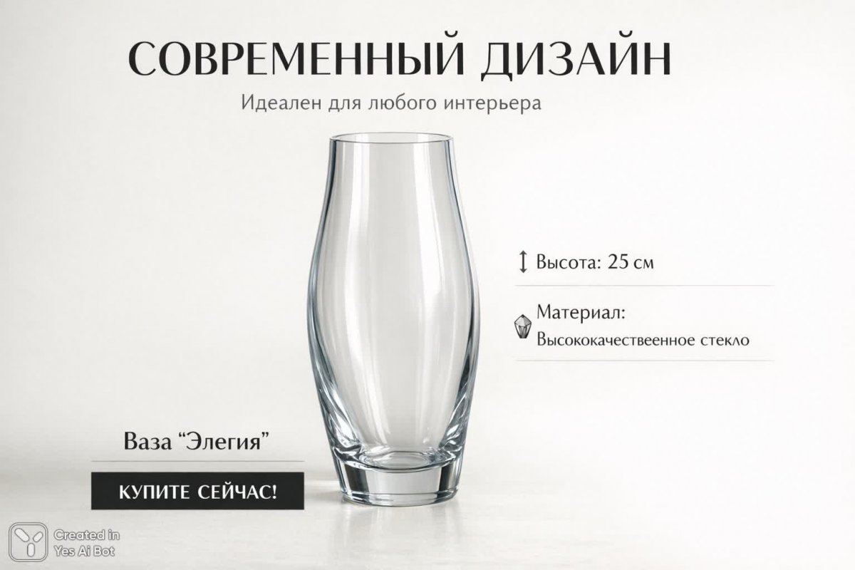 Prompt: Создайте инфографику для стеклянной вазы "Элегия": фотография изделия на нейтральном фоновом цвете, акцент на гладкую поверхность и элегантные линии. Добавить текст “Современный дизайн: идеален для любого интерьера”, указать размер и материал. Использовать минималистичный стиль, крупный шрифт для преимущества, добавить кнопку “Купите сейчас!” для побуждения к действию.